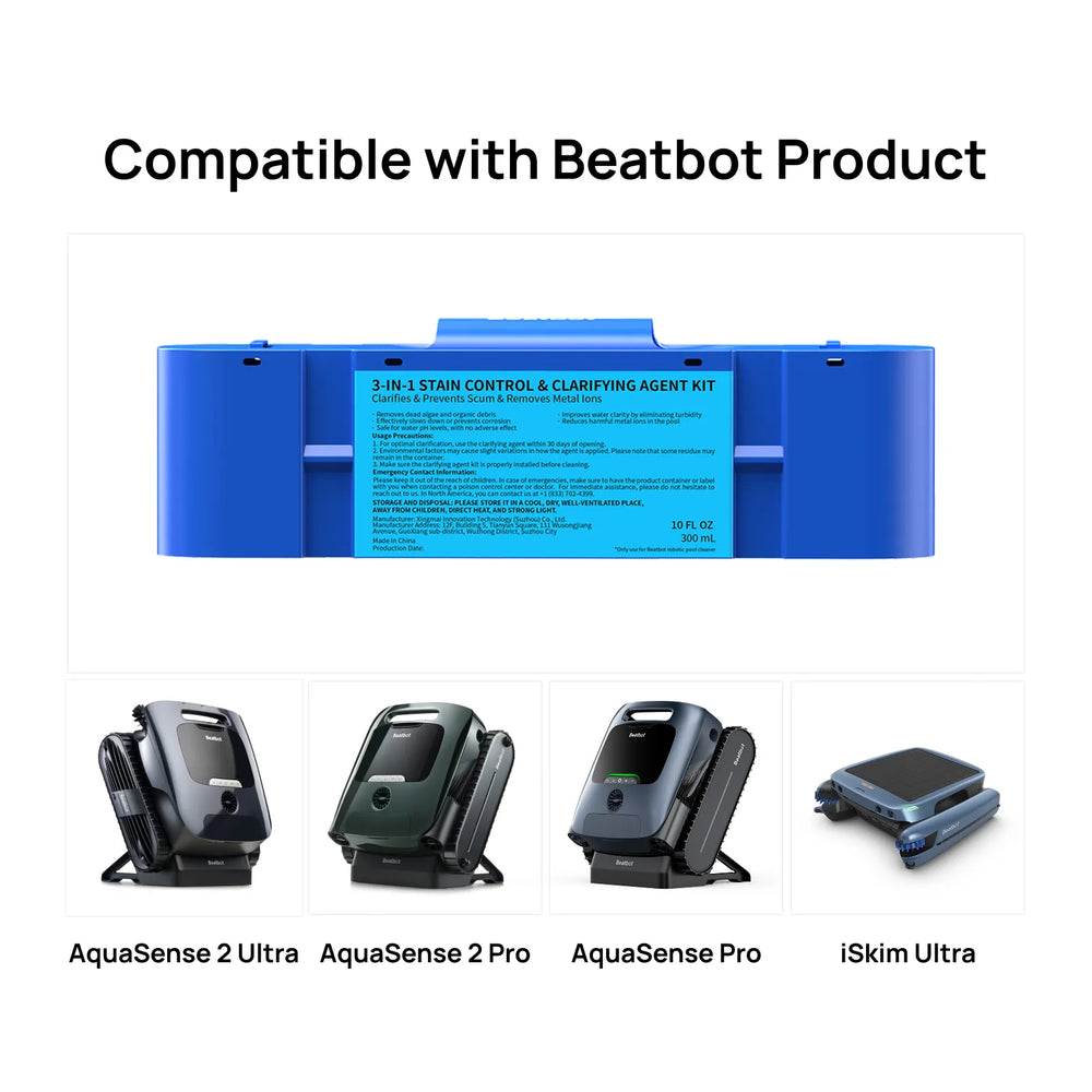 Auto-dispensing 3-in-1 clarifier cartridge removes metals, debris, and cloudiness while helping prevent scaling and corrosion in Beatbot robotic cleaners.