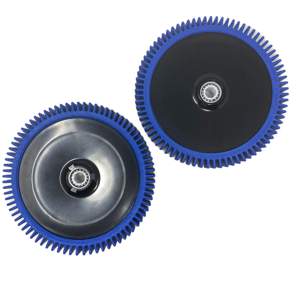 The wheels are black to match the color design of the cleaner (tires are blue) and the kit comes with a pair which are required for the cleaner to effectively operate. Also, there are retainer clips that lock and hold the rear wheels into place on the lower assembly kit ensuring they do not fall off as the cleaner is operating.